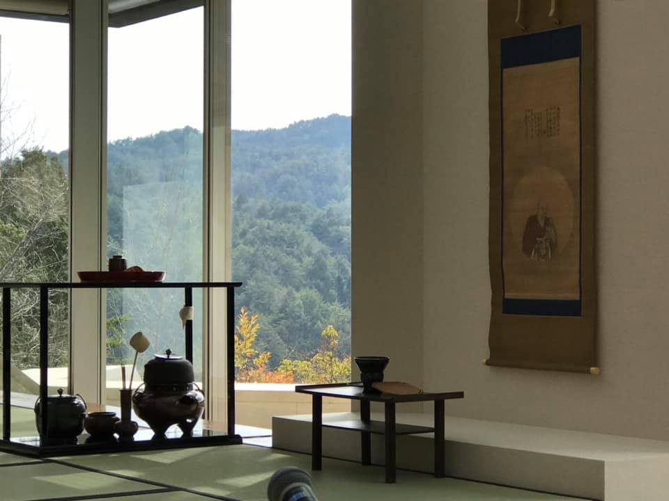 20日、MIHO MUSEUM「大徳寺龍光院 国宝 曜変天目と破草鞋(はそうあい)」の内覧会にて。遠州流御家元による献茶式が行われました。手前下のマイクが邪魔ですが、取材陣のものゆえ、お許しを。最前列で拝見するために、この場所で30分待ち。祭り取材で待ちに慣れているとはいえ、入り口で履き替えたピンヒールでは足がつらく、しかし、その甲斐あって、括られている白い袱紗がどう扱われるか、しかと見届けることに成功。マスクを使われないことも含め、裏千家の献茶式とは全く違うのでした。
