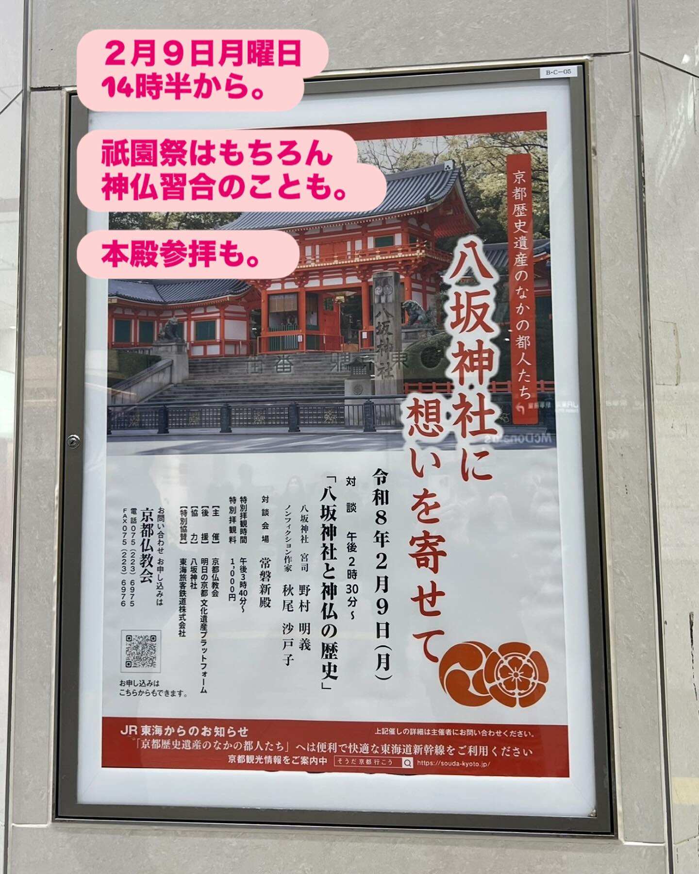 八坂神社野村宮司さんと対談します 2026.01.13 Posted on 2026年1月13日2026年1月17日 by satokoa 2月9日午後、八坂神社にいらっしゃいませんか。野村宮司さんとお話します。 京都仏教会が主催ですので、神仏集合、牛頭天王についても。また、本殿に参拝する貴重なチャンス。おそらく本殿裏にも入れます。 写真は、東京駅八重洲口でみつけたポスター。JR東海が協賛してくれていますゆえ。