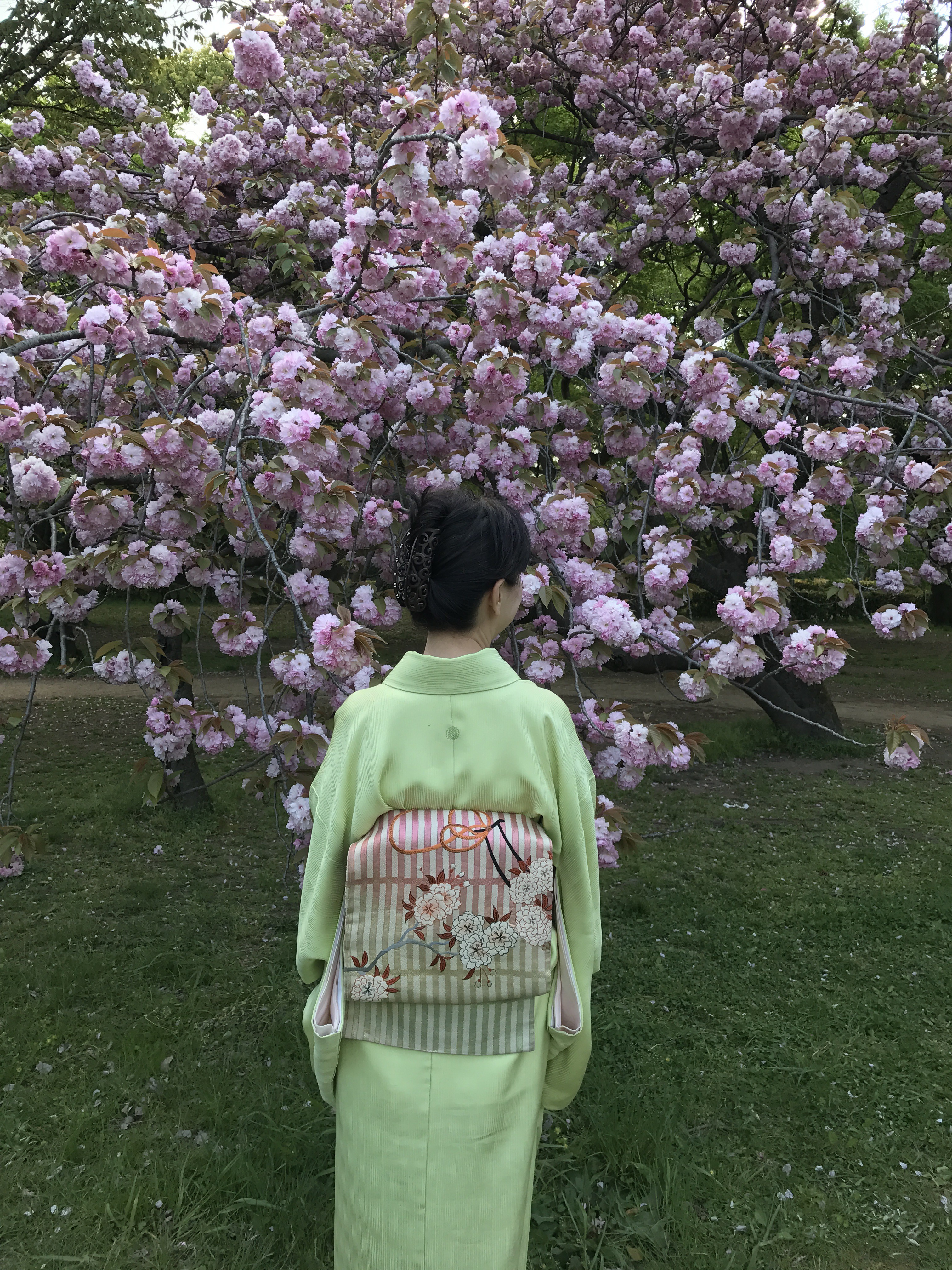 御所の里桜がきれいだったーー。そんな声をあちこちで耳にしたので行ってみて、びっくり。おおぶりで重たそうな桜の満開の下で、昼寝する人、読書する人、いろいろで、自前の八重桜文の帯をカメラに納めるのさえ、難儀なほどでございました。重たいから姿が隠れて、昼寝しやすいのでしょうね。