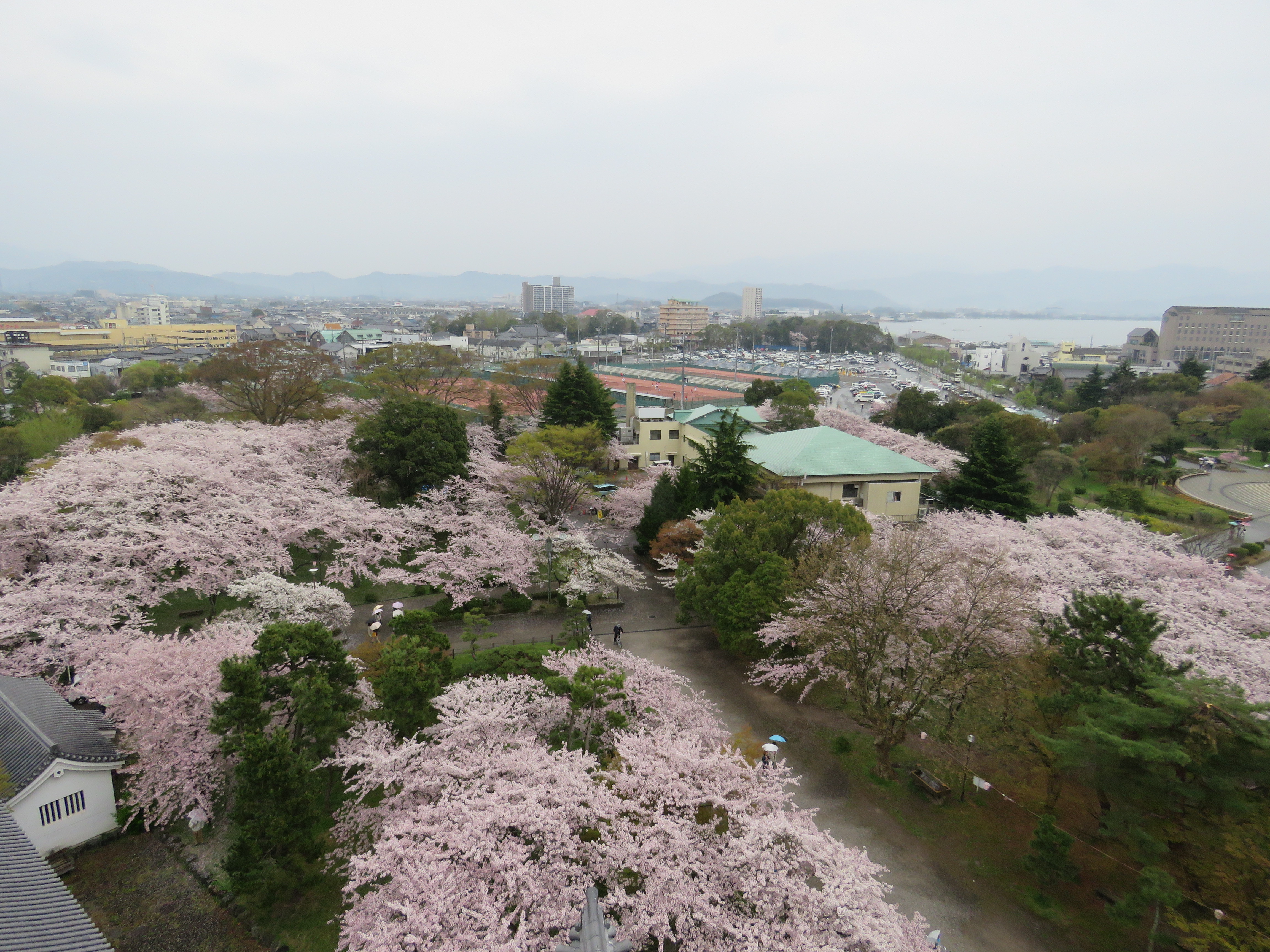 長浜で初めて下車しました。最初に訪れた長浜城は、あいにくの雨。琵琶湖畔の町が桜色に染まっている景色をを堪能して、下界へ降りたのでした。