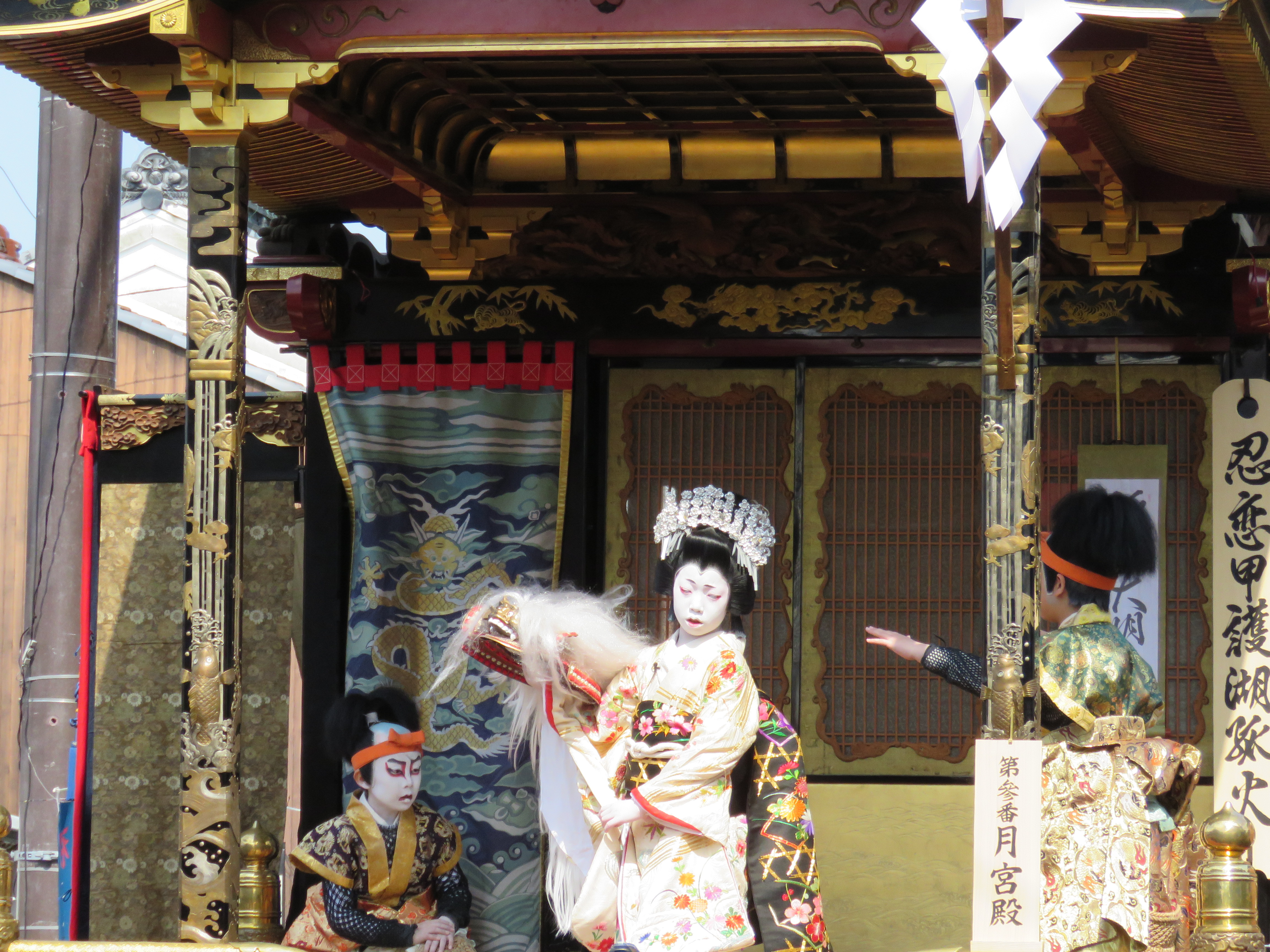 驚いたことに、午後には眩しいほどの晴天に。地元の少年たちが歌舞伎を演じ、山が町々を移動していきます。単なる学芸会と違って、コスプレの極みを味わうわけですから、なんとも羨ましいかぎり。こういう経験をもつ子どもは将来、どんな人生を歩むのでしょうね。