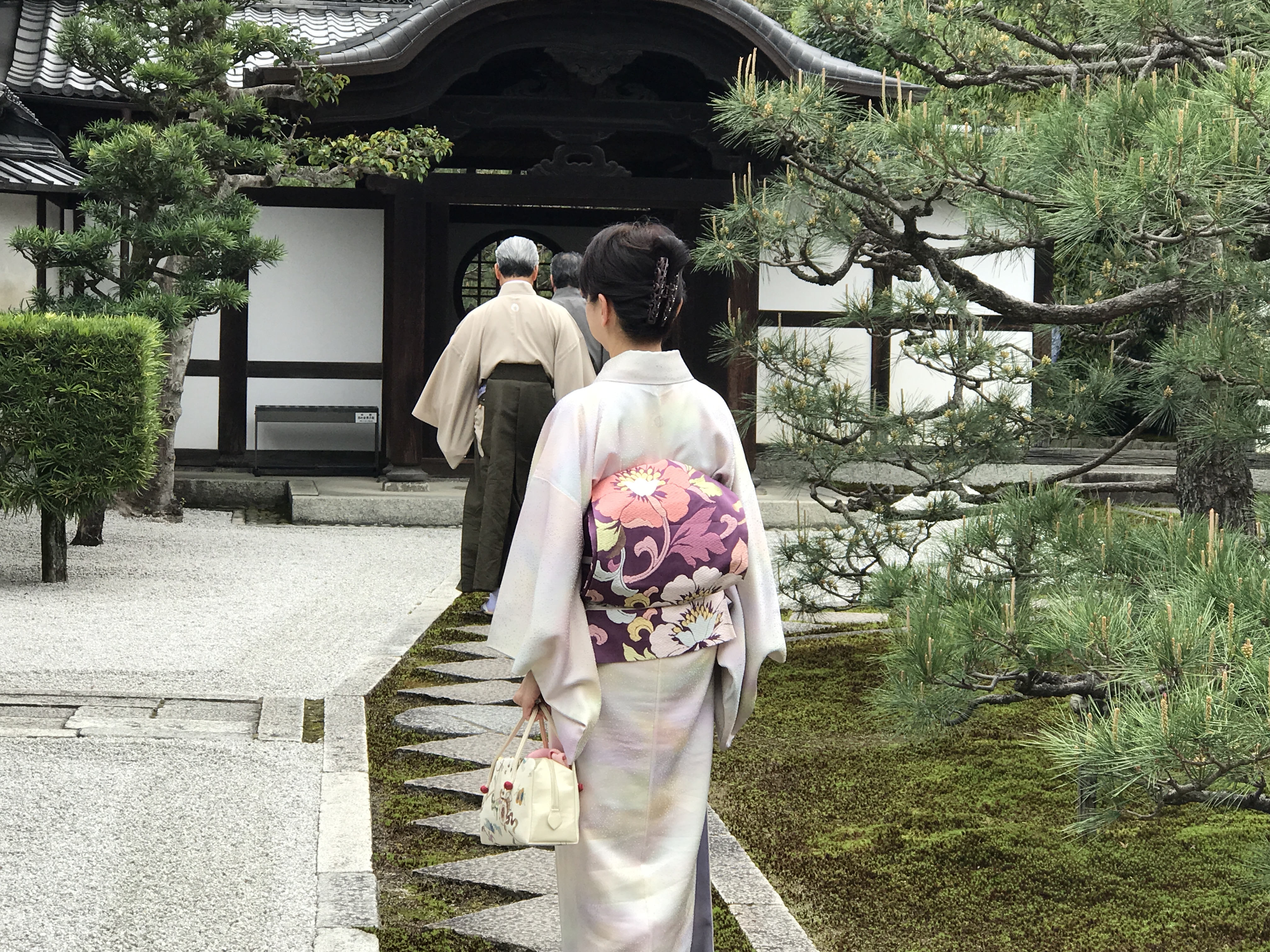 装いは、紬に桜の刺繍帯。朝は同じ色のレインコートを着ておりました。