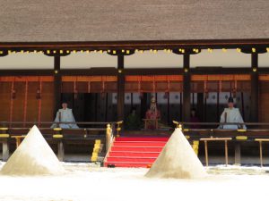 烏相撲は、上賀茂神社のヤタガラス伝説と、不作をもたらす悪霊退治の信仰である相撲、宮中の相撲の節会があわさって出来たものだと言われています。刀根が烏飛びなどの作法をして、子どもたちが相撲をとるのです。個人情報の保護から、写真はアップ できないのが残念です。