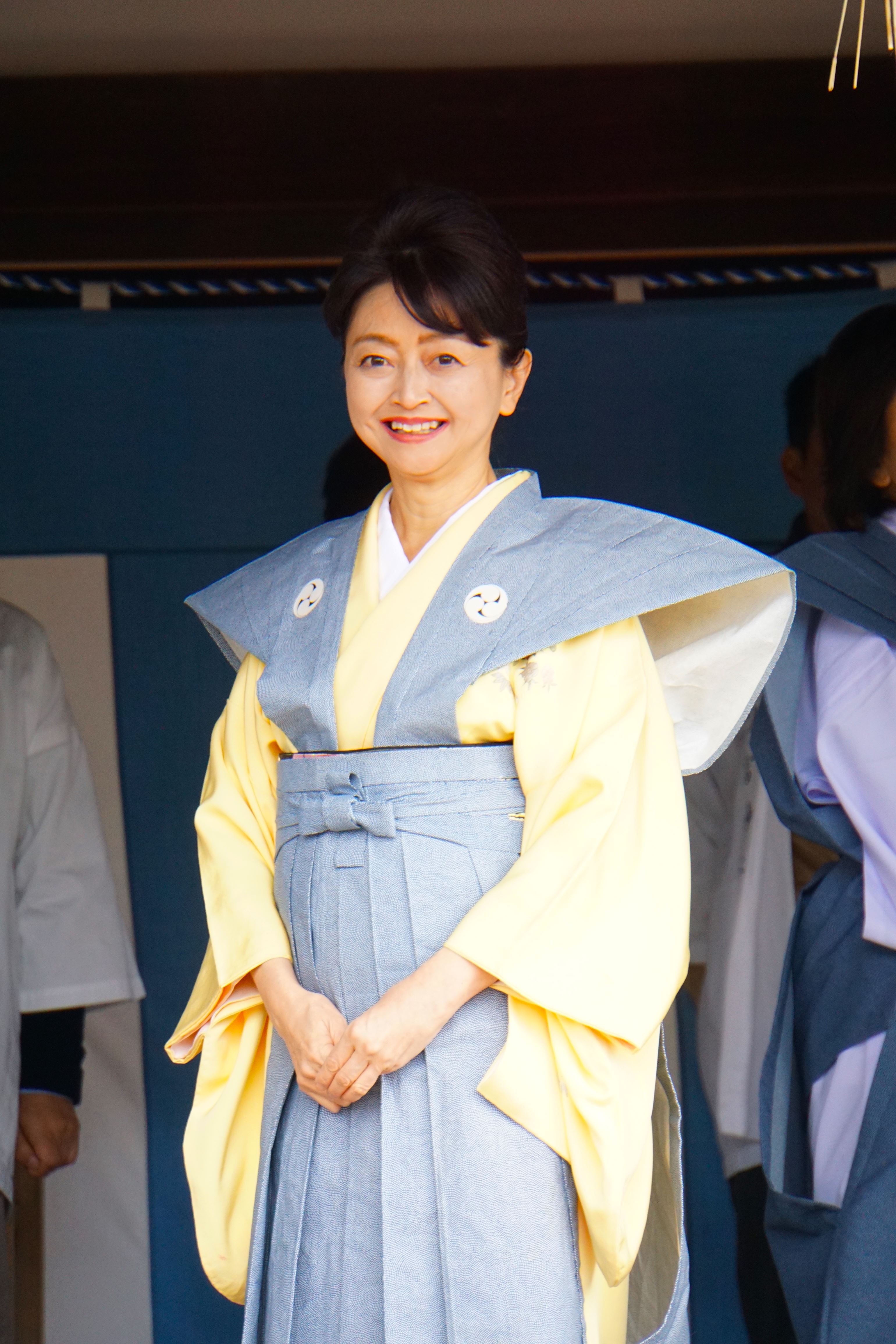 神社には貸衣装が用意されていたのですが、私は下に自前の着物を纏い、裃だけお借りする形をとりました。裃がブルーかグレーの可能性を考え、卵色を選択。同様の色無地はなかったので、袖に控えめながら刺繍はありますが。
