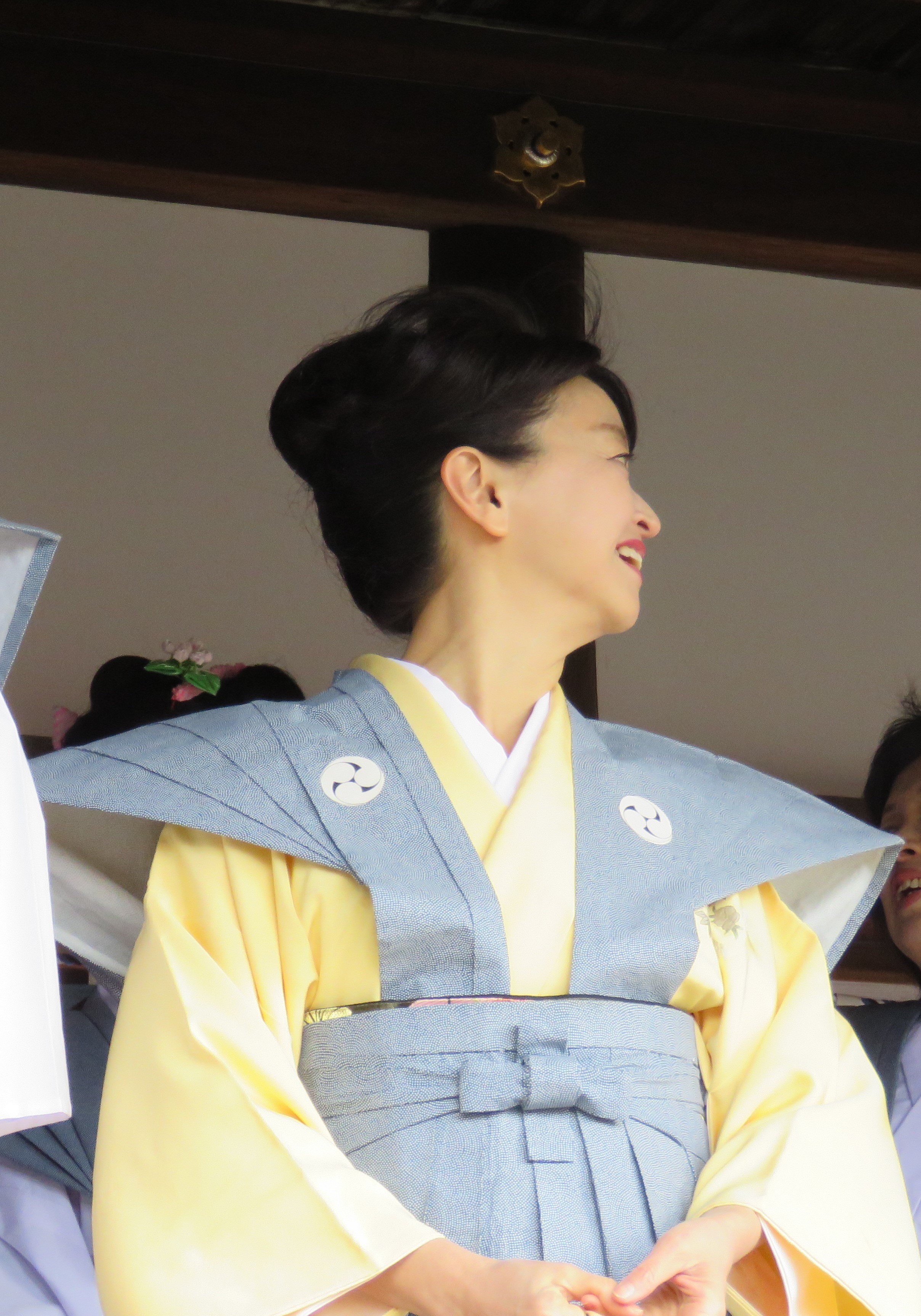 生まれて初めて着用した裃。袴部分、女性は上のほうで結ぶので、いつもの着物の丈だと、裾はみでてしまいます。着付けの部屋に鏡がなかったため、外に出て気づいた次第。1回目の豆まきの後に、短く着直しました。帯は二部式にしていあるものを締めていったので、お太鼓をはずせば問題なし。