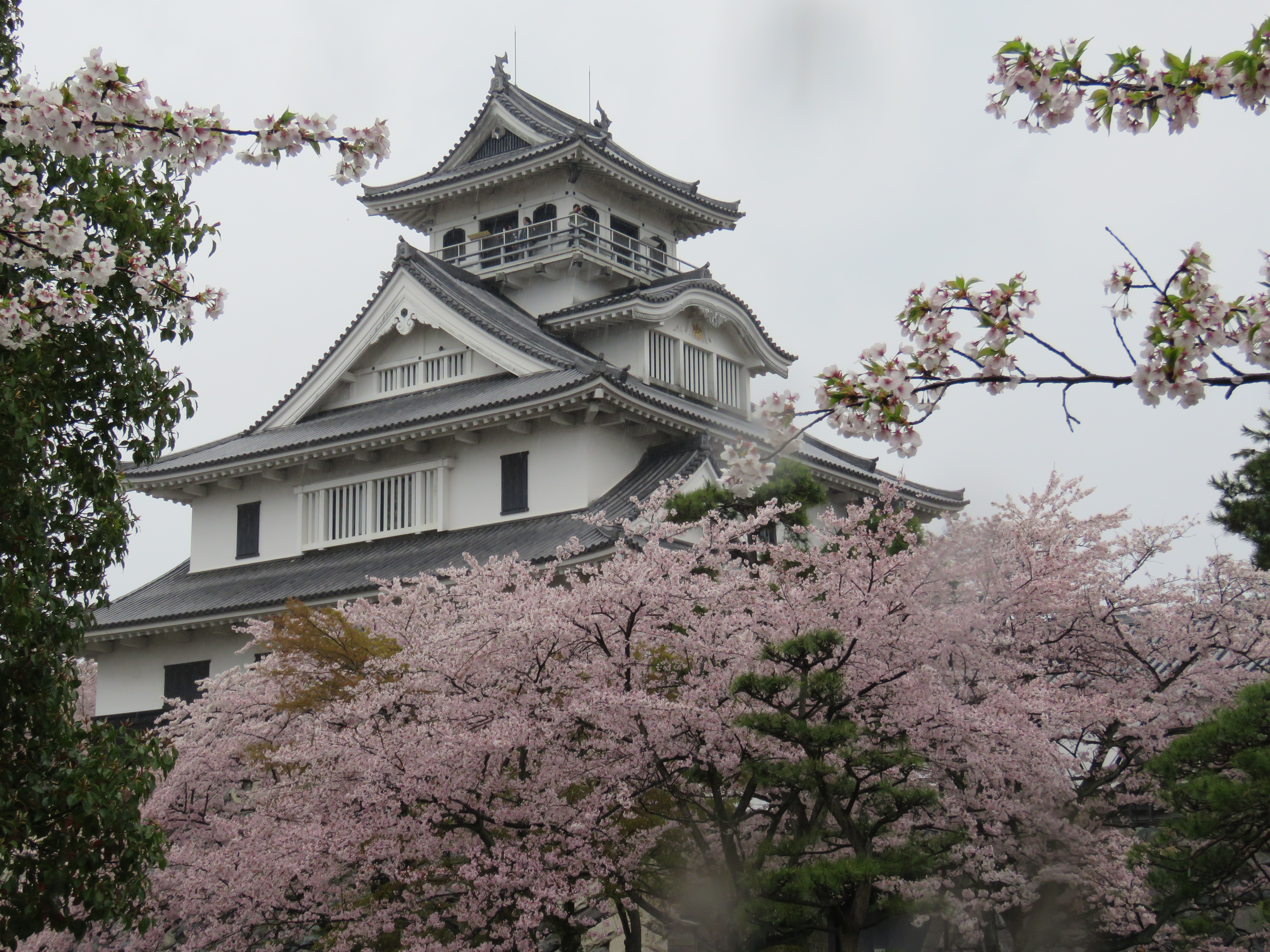 長浜で初めて下車しました。最初に訪れた長浜城は、あいにくの雨。琵琶湖畔の町が桜色に染まっている景色をを堪能して、下界へ降りたのでした。