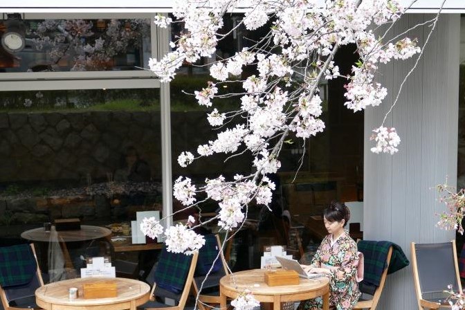 桜吹雪の舞うサイドウォークカフェ。