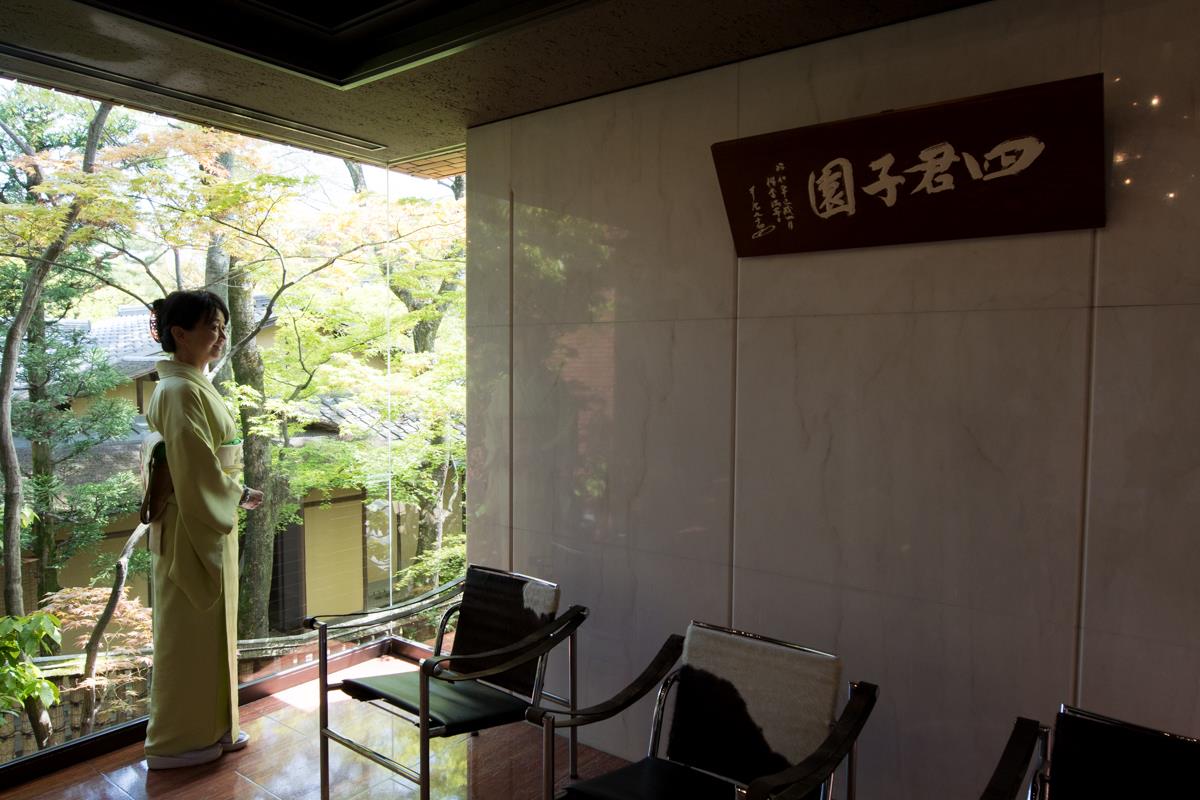 そのあとは特別公開の四君子苑へ。数寄屋造りの四君子苑は、北村謹次郎氏の元自宅。修学院離宮の美しい景色に負けない感動を得られます。正客に大文字を見せるよう設計された茶室。角に柱のない窓は開放的で、薄紅色の枝垂れが残る中庭を眺められる書斎のデスクに腰かけながら、ここで執筆できたら、さぞや大物の作家になれるに違いないと、つかの間至福の時間を頂きました。