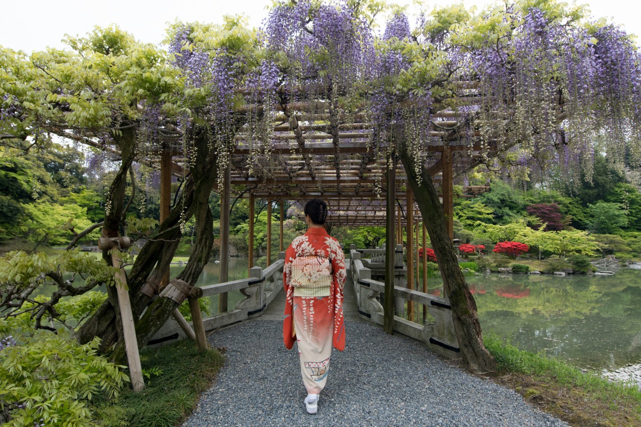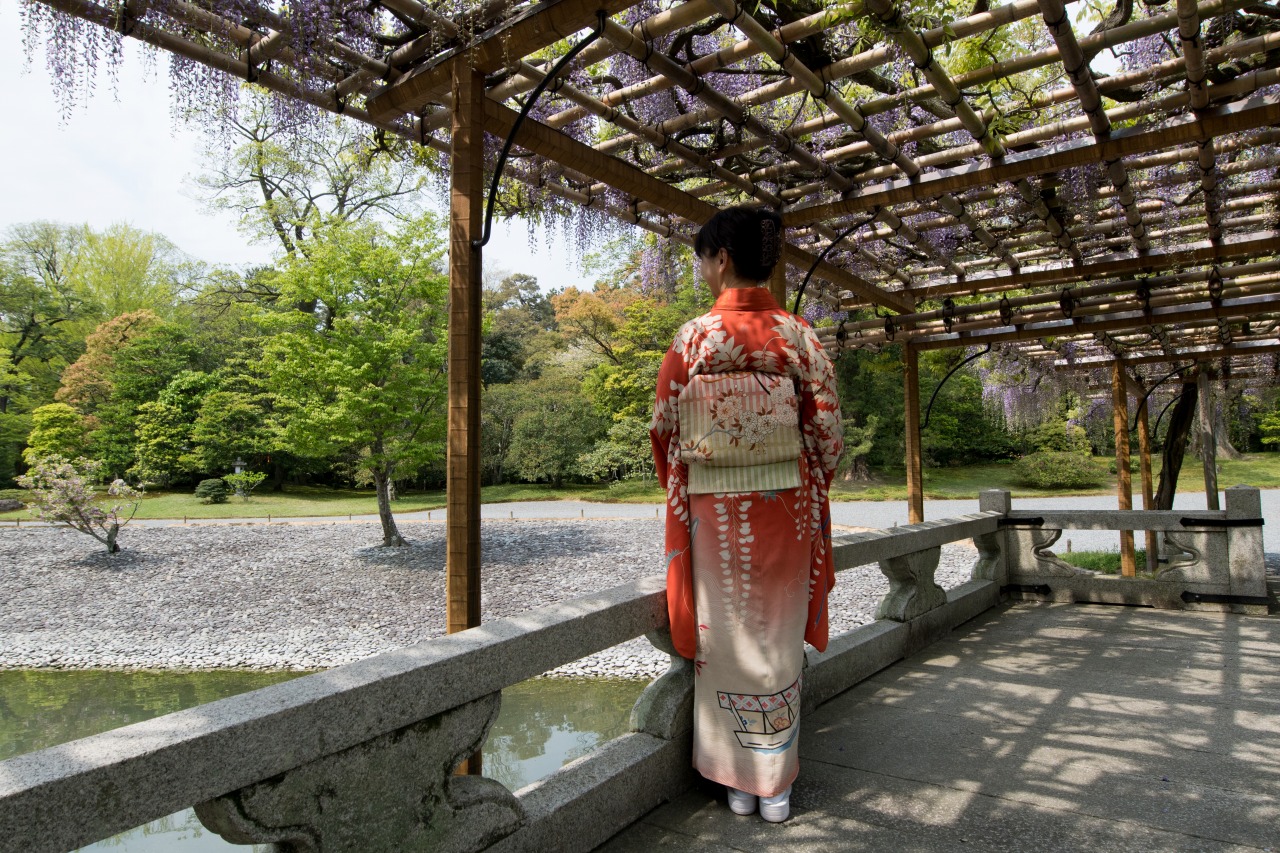 藤文の中振袖で仙洞御所へ。事前申し込みの場合、花の咲き具合が読めないのが難しいところ。もう1週間経つと、たわわに花開いた藤が楽しめたのですが。