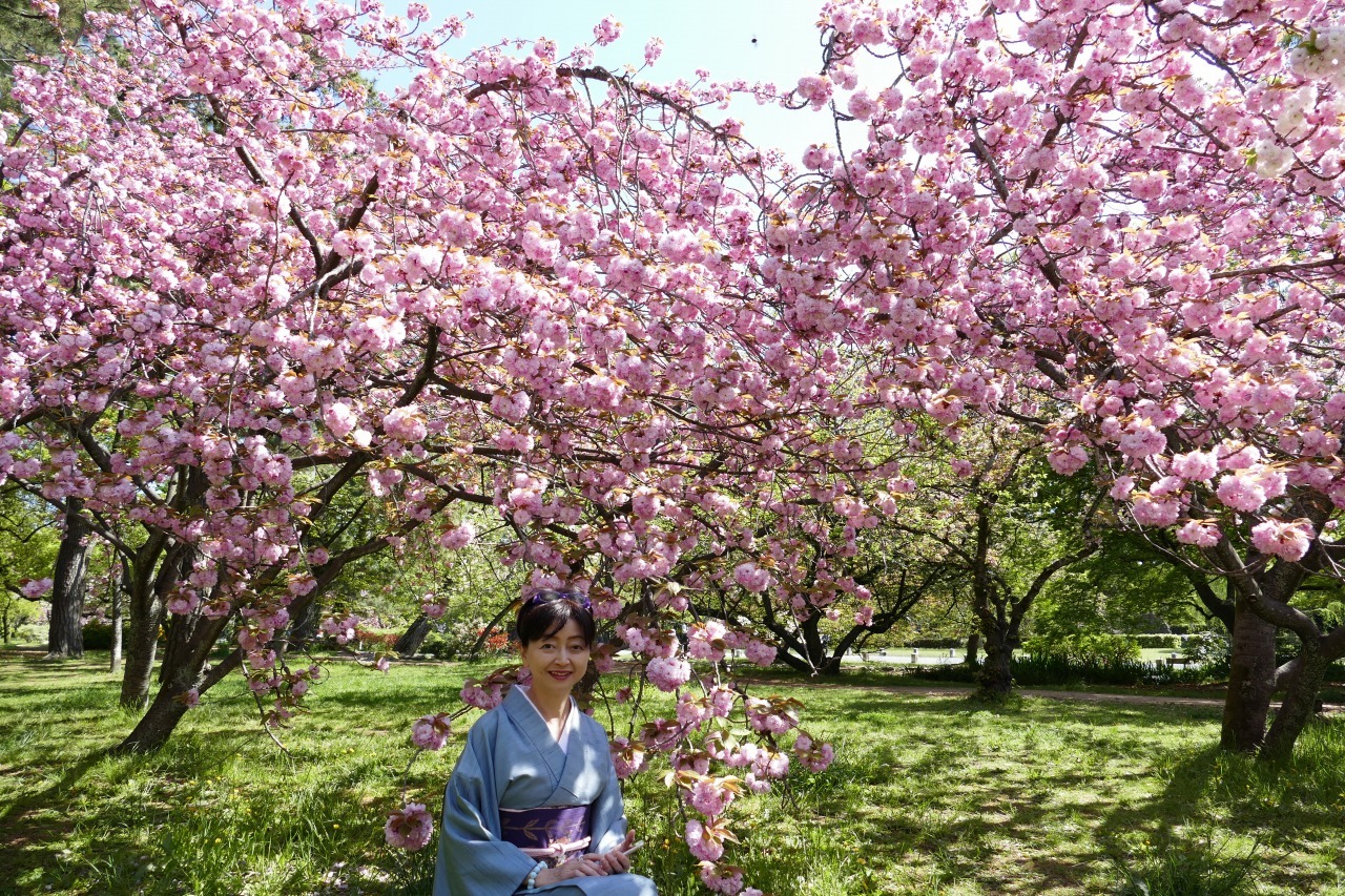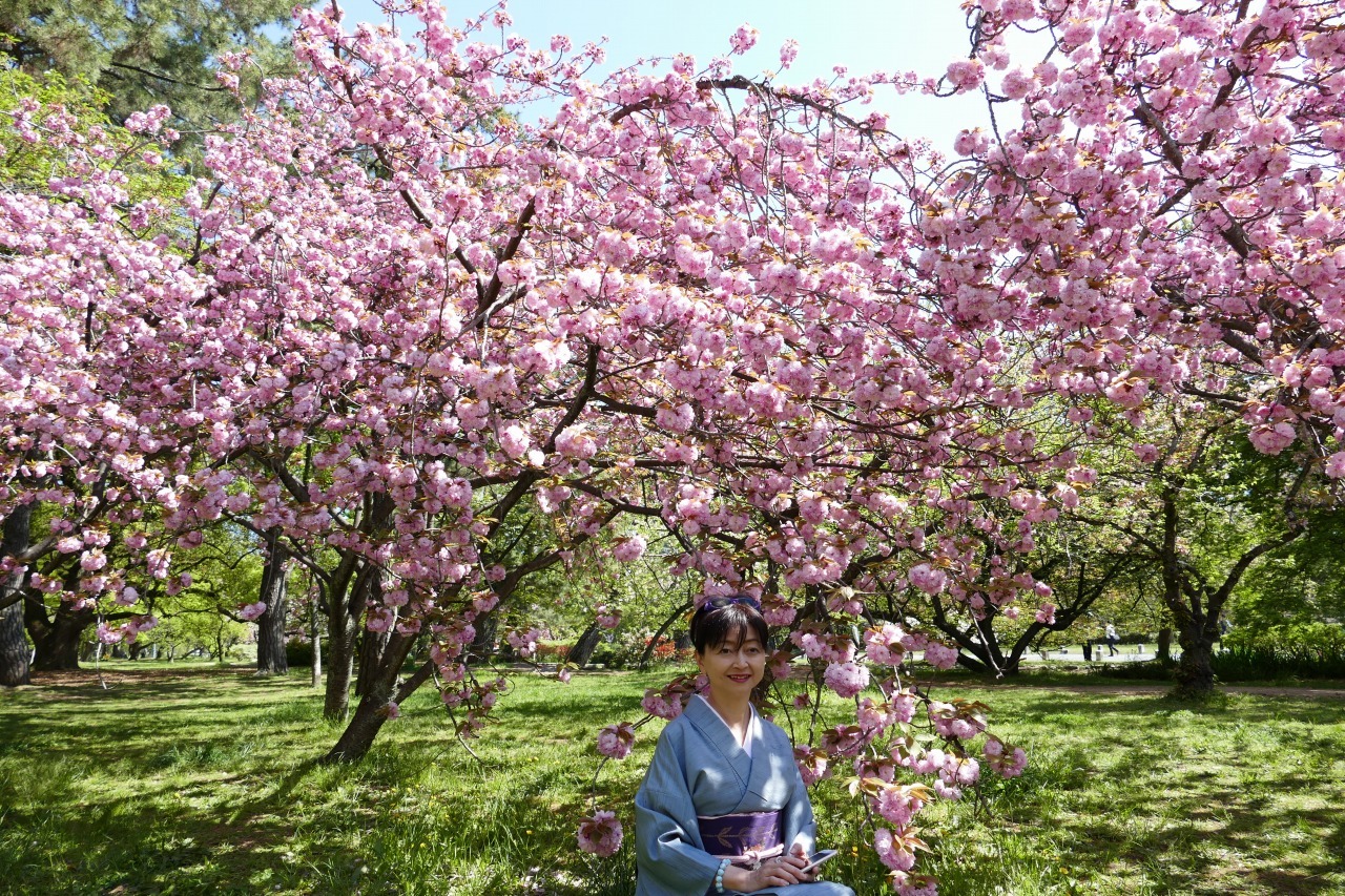 御所の里桜がきれいだったーー。そんな声をあちこちで耳にしたので行ってみて、びっくり。おおぶりで重たそうな桜の満開の下で、昼寝する人、読書する人、いろいろで、自前の八重桜文の帯をカメラに納めるのさえ、難儀なほどでございました。重たいから姿が隠れて、昼寝しやすいのでしょうね。