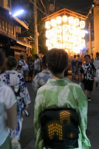 宵山に建てられた鉾の駒形提灯と一緒にカメラに収めたい。でも、難しいことが2つ。提灯が明るいので、帯が暗くなる。洋服の人が写り込む。ポロシャツに短パンだったりするから、興ざめなのです。