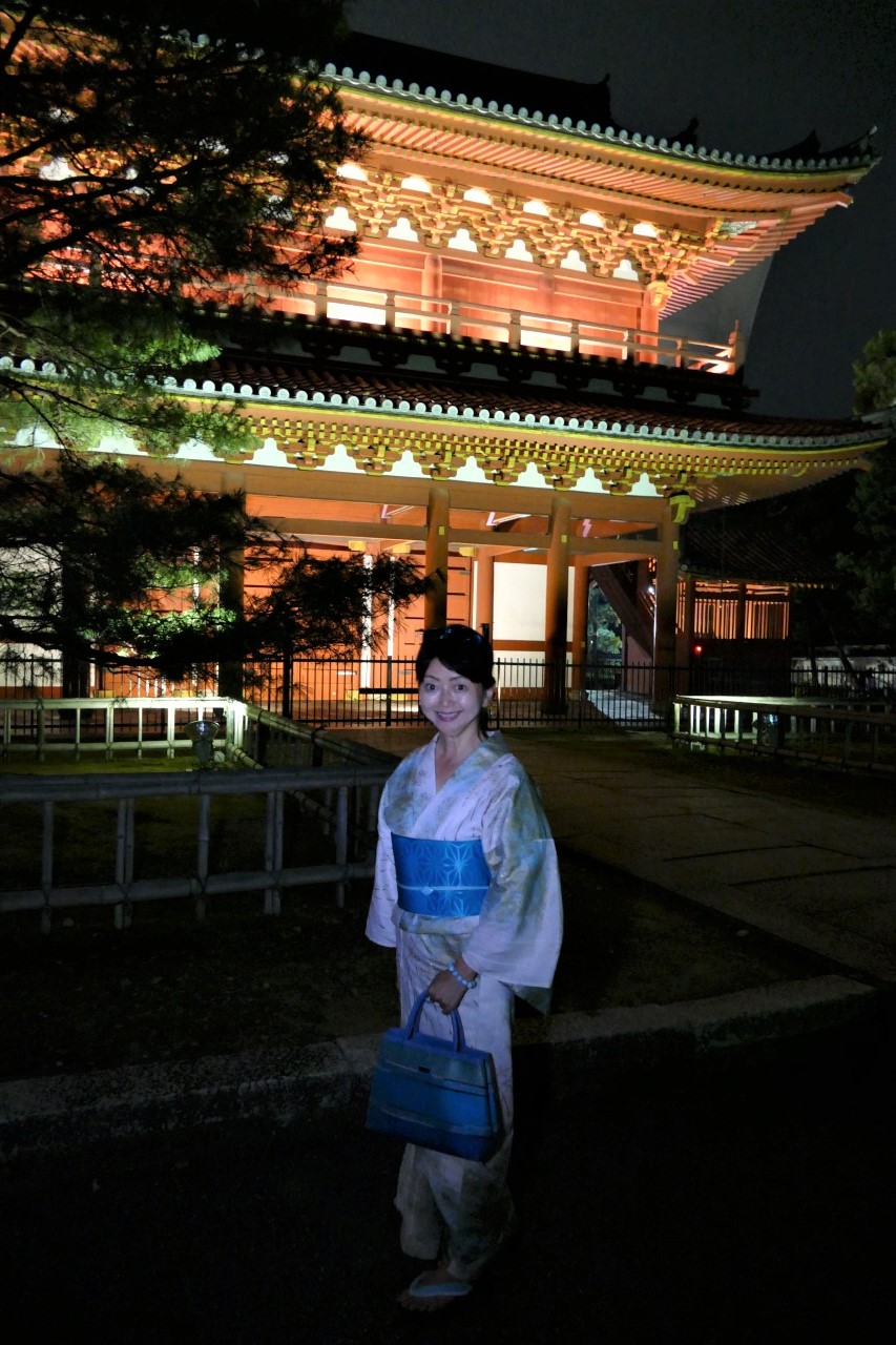 誉田屋製花火文の浴衣。麻の葉文ターコイスの付け帯にラリマーの帯留。濡れても大丈夫な装いで。バッグはタイのジムトンプソン。