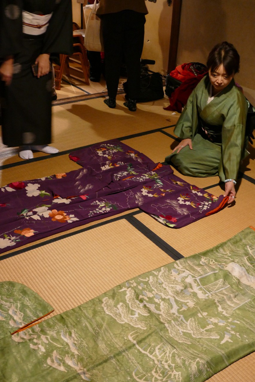 吉田塾で、小袖の講座。紫の着物には藤と牡丹が刺繍されている。中には、うっすらと真綿。萌黄色は藍を使って出すのだが、白い部分は糊で伏せ、雪景色を描いている。吉田先生によれば、芝垣と黒木の鳥居から、テーマは「野宮」、きっと「源氏物語」がお好みなのだろう。お召し物からそう推察するのが、当時の上流階級のセンス。そう、お金だけ持って偉そうにしている現代の富裕層とは違うのです。