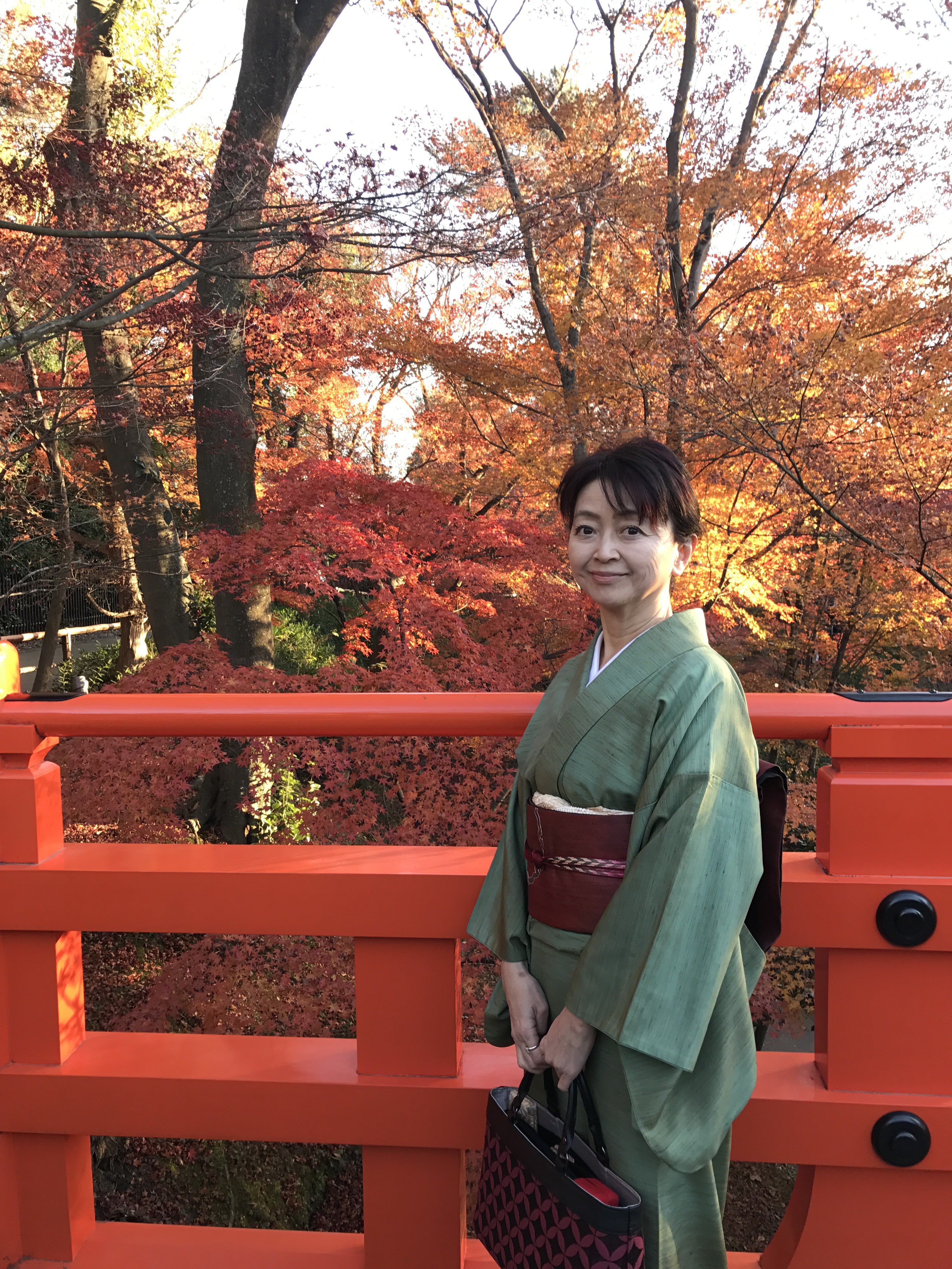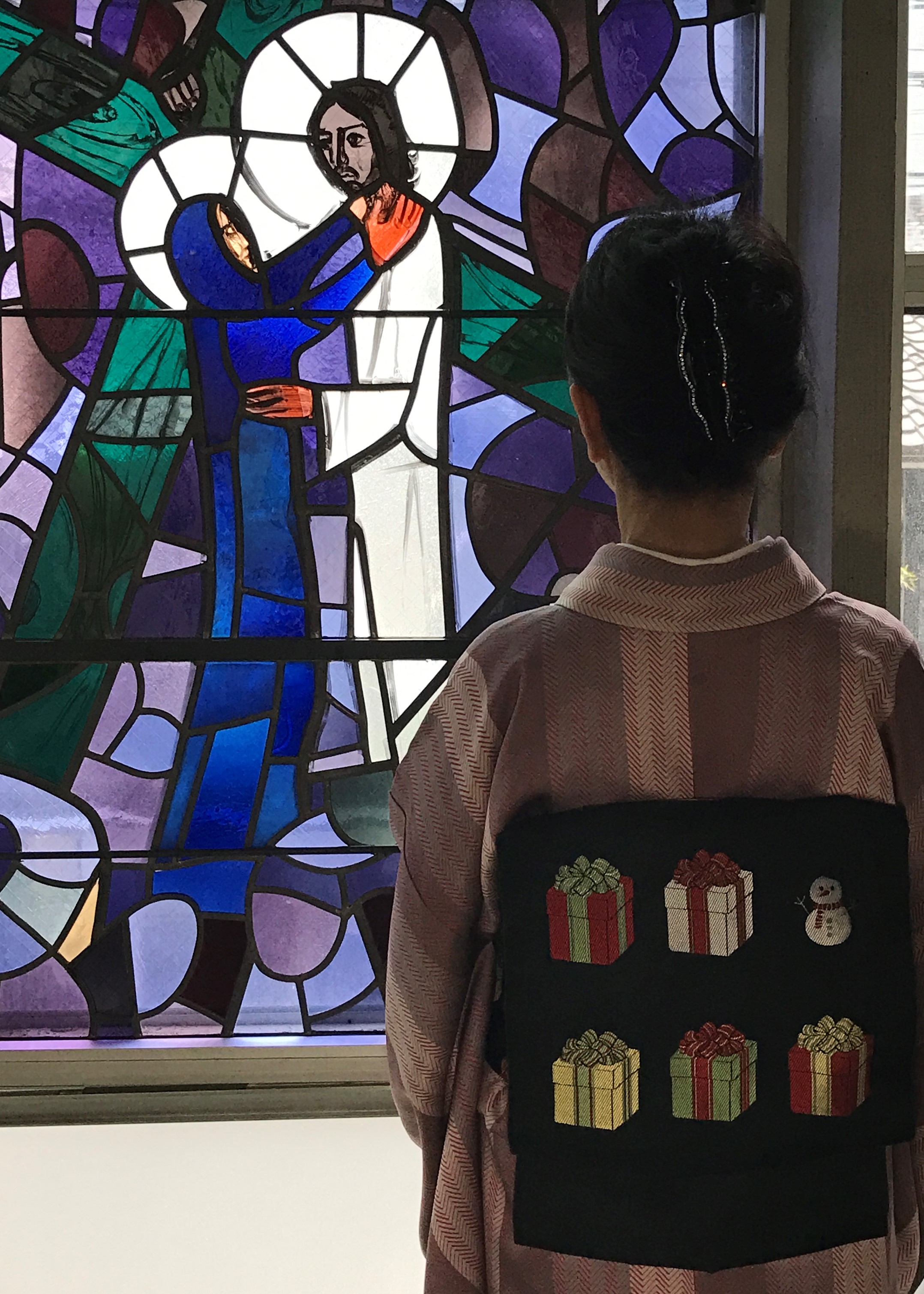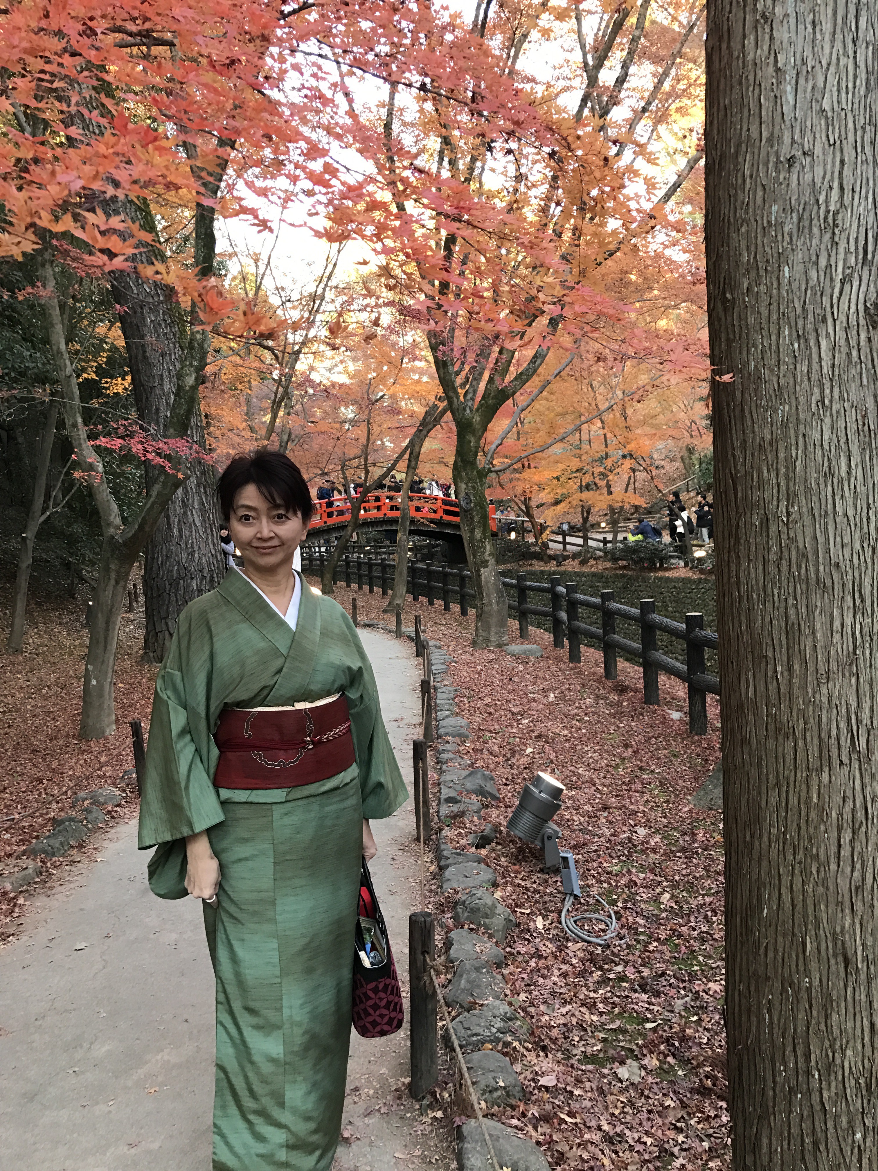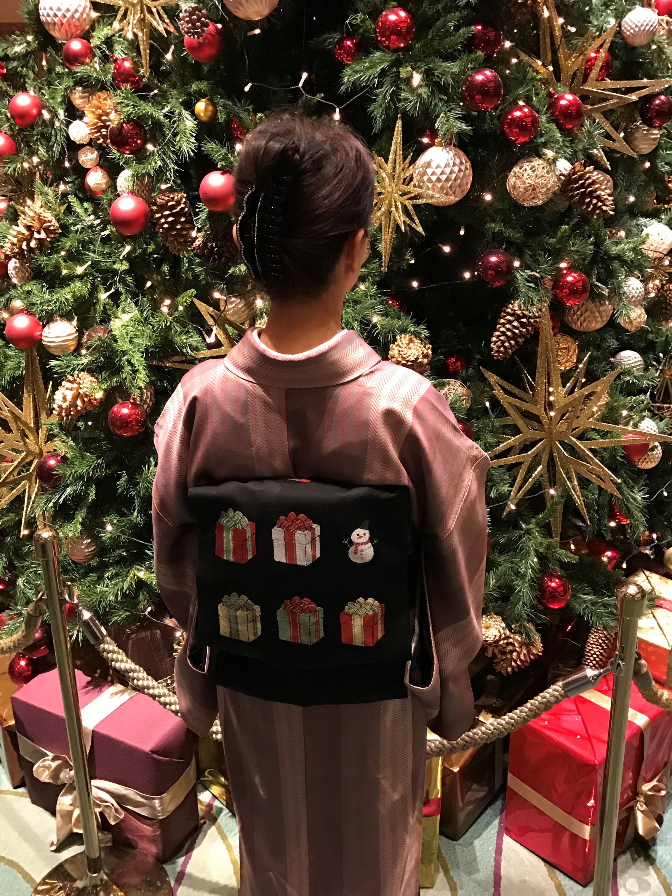 年に数回、日本文化を語るサロンが開かれます。クリスマス前なので、グリーン系の色無地に、クリスマスリースの帯留(実はブローチ)。井上八千代先生はインド更紗を使った紅い帯をお召しでしたので、記念撮影させていただきました。