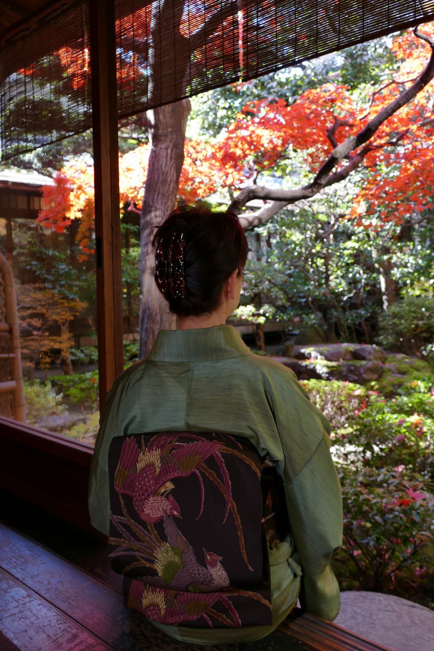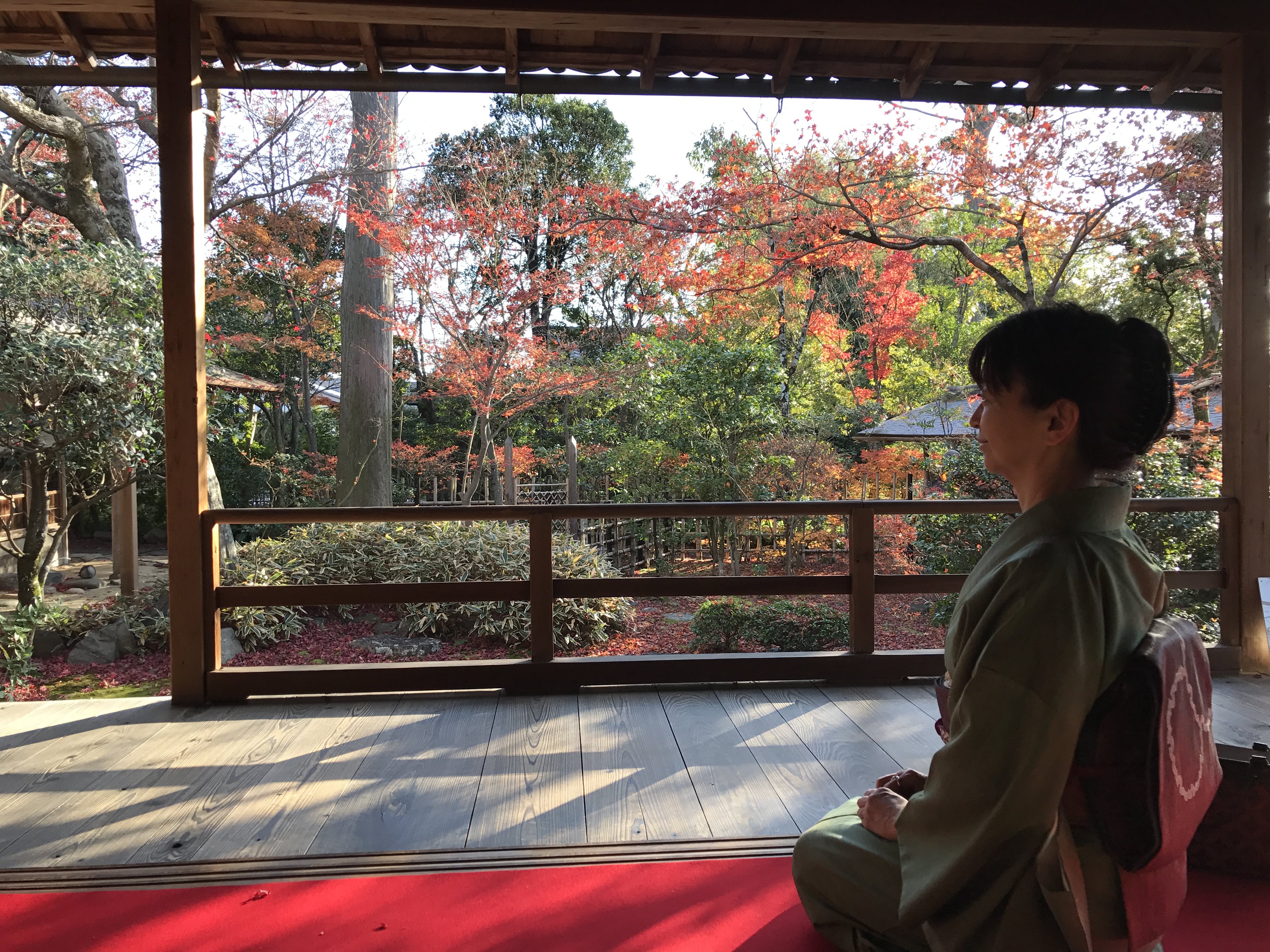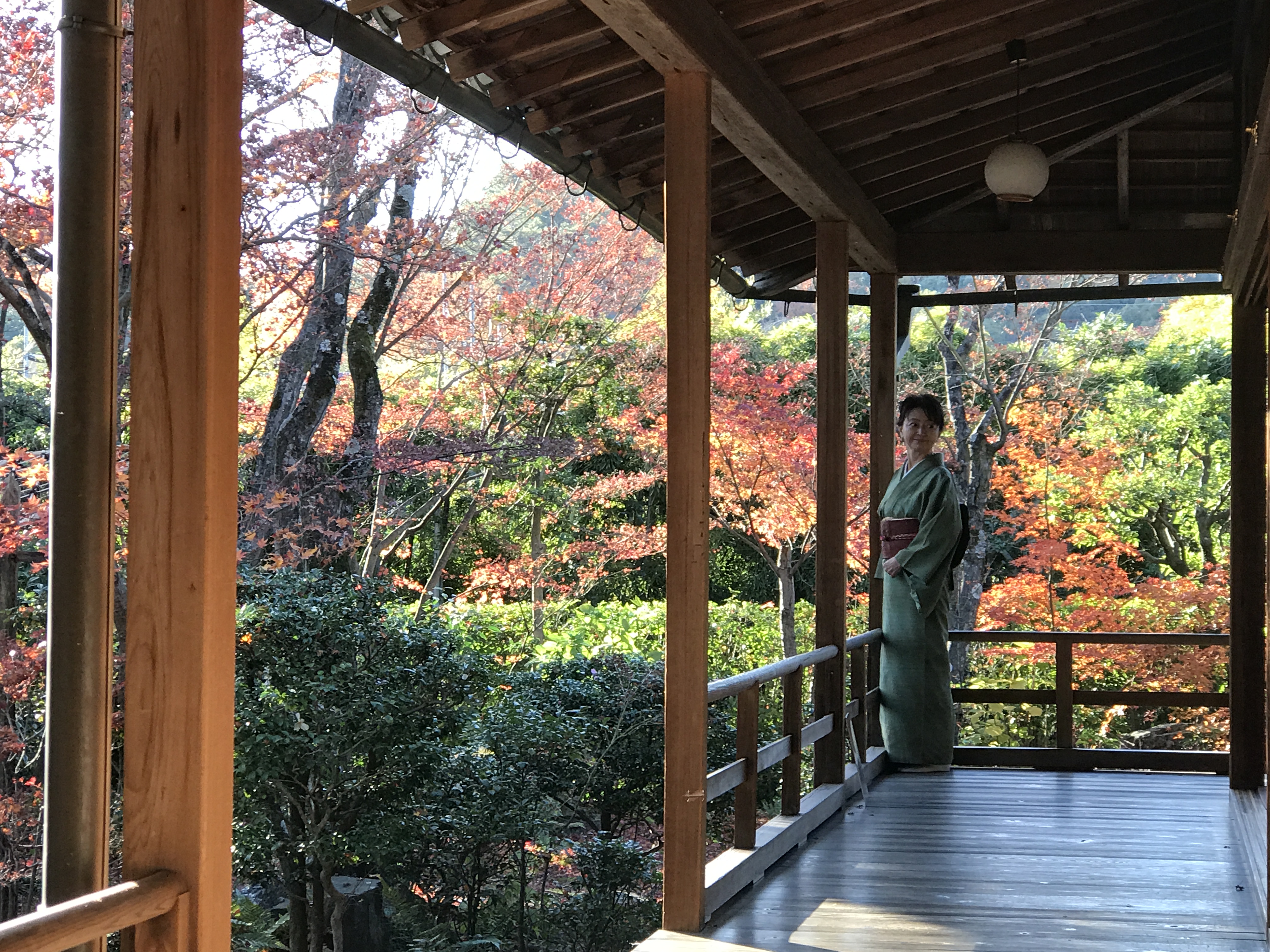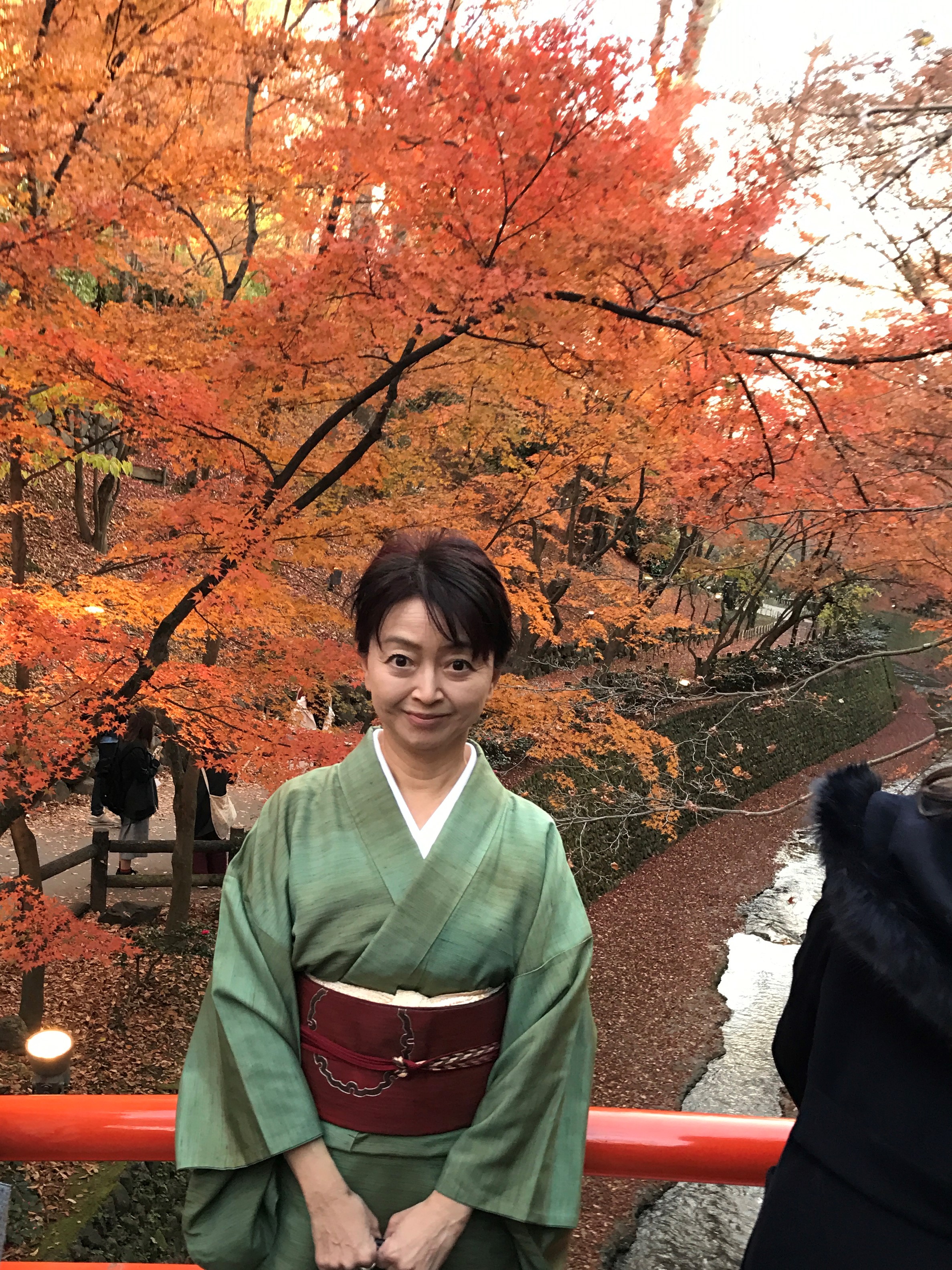 年に数回、日本文化を語るサロンが開かれます。クリスマス前なので、グリーン系の色無地に、クリスマスリースの帯留(実はブローチ)。井上八千代先生はインド更紗を使った紅い帯をお召しでしたので、記念撮影させていただきました。