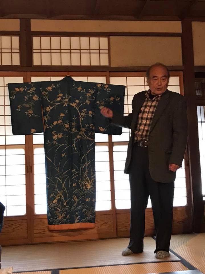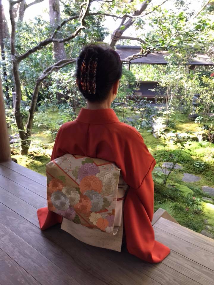 印傳の葵の着物に★の帯。お太鼓には梟が浮き上がりますが、「太一」という文字を書いたゆえ。太一とは、古代中国において宇宙の根元、北極星を表し、日本では天照大神を表すのです。