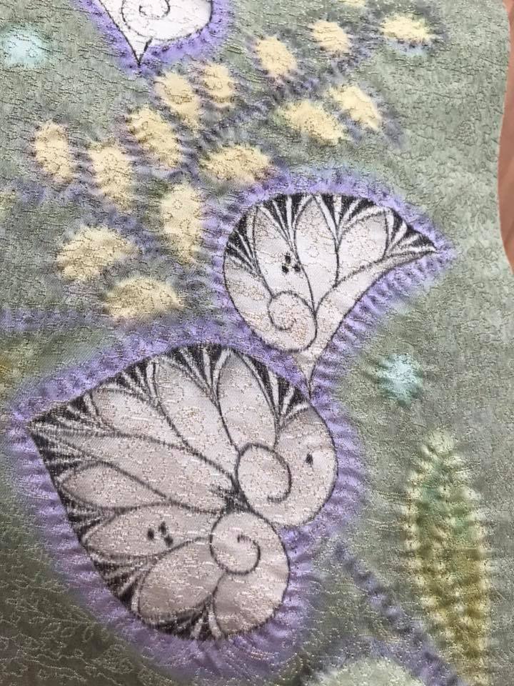 刺繍帯の、お太鼓は菊、前は紅葉。正倉院展を意識して、螺鈿の帯も候補だったのだが、季節優先で。