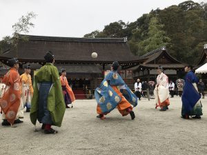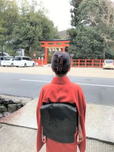 大きな梅文は私のように背の低い者には似合いませんが、三窪ちゃんにはよく映ります。私のは椿と梅が同居したもの。お席を終えられた吉田市蔵さんに玄関でばったり会い、撮影して頂きました。
