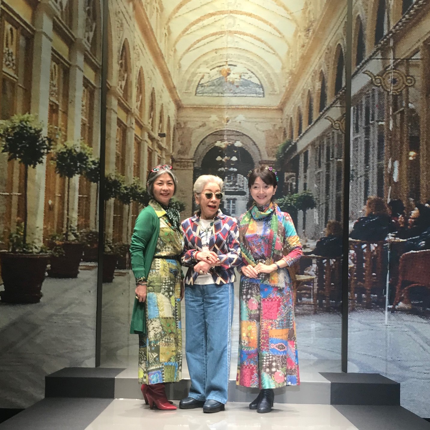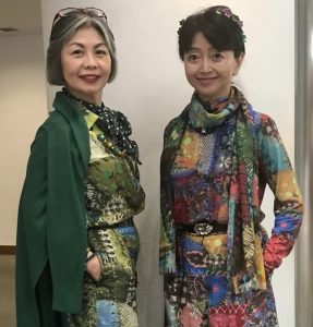 いま最もお気に入り。昨秋から今年にかけて、よく着たこの洋服は、鳥居ユキ先生のデザインです。コロナ禍で、東京コレクションが開催されなかったのが一番残念かも。写真は、会場ロビーで、美馬のゆり博士と。色違いシスターズ。