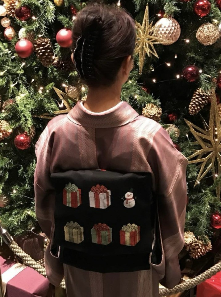 小紋の着物に締めている帯は、誉田屋源兵衛製。#奄美のハイビスカスで染めたもの。#大樋焼の飴釉 を意識して、この色を選びました。帯締は、#炭治郎カラー。祖母の形見です。