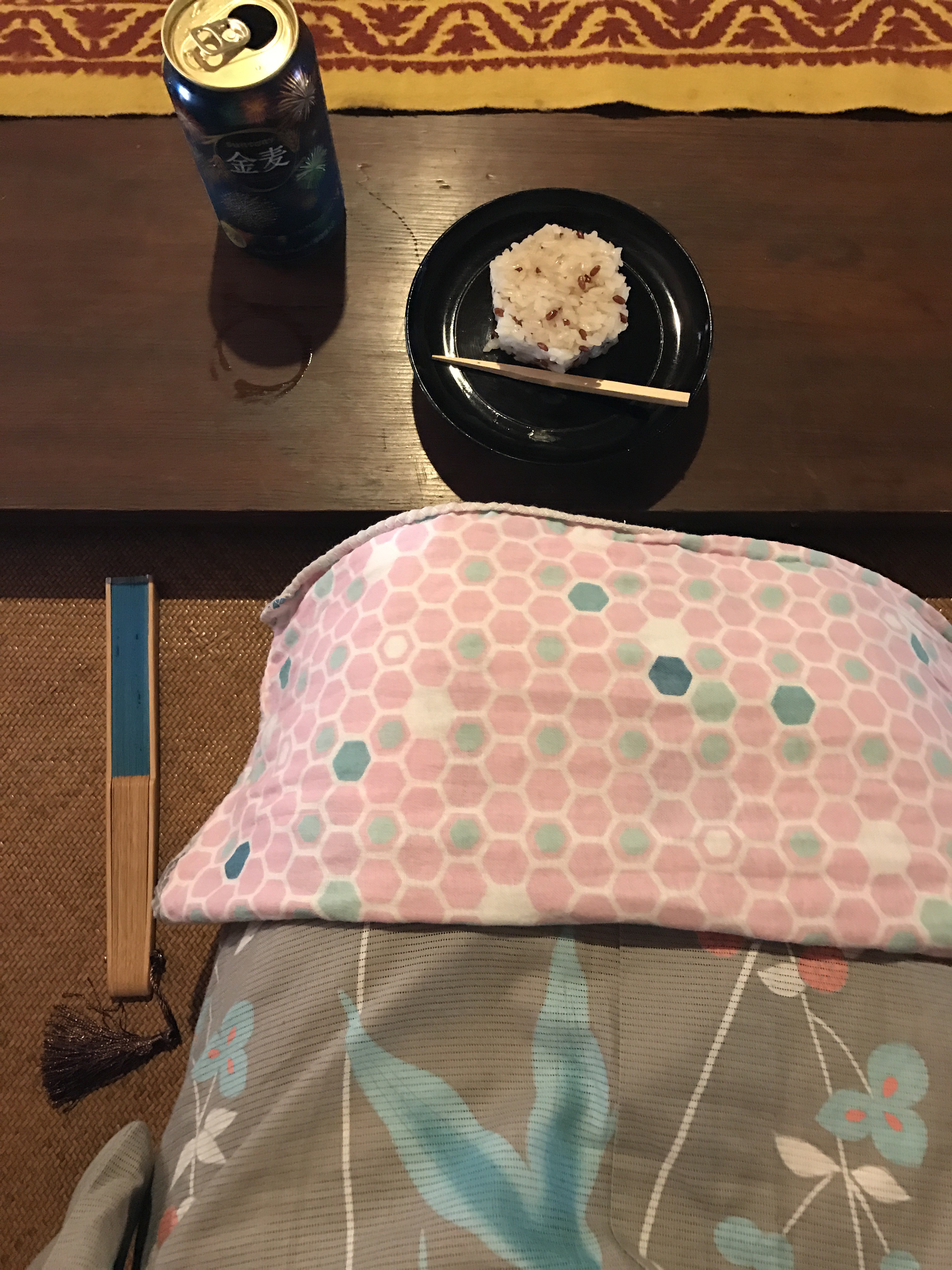 3枚目の写真は、私目線で膝の上を撮影。「六角」は北観音山が六角町であることからご先祖が編み出されたようですね。私自身も六角の描かれたガーゼ手ぬぐいを持参、吉田家の家紋「オモダカ文」の浴衣、扇子も含めて、北観音山の法被と同じターコイスブルーでコーディネートしています。