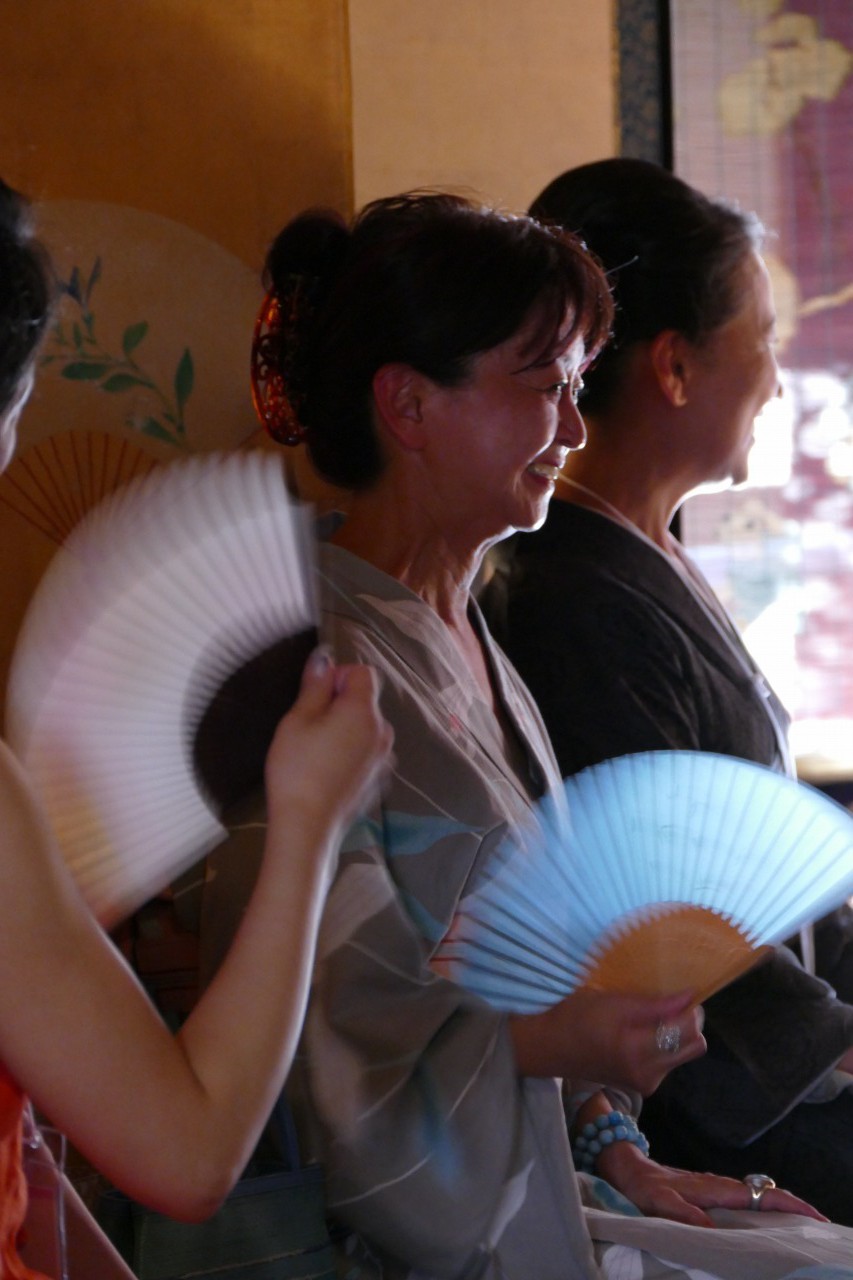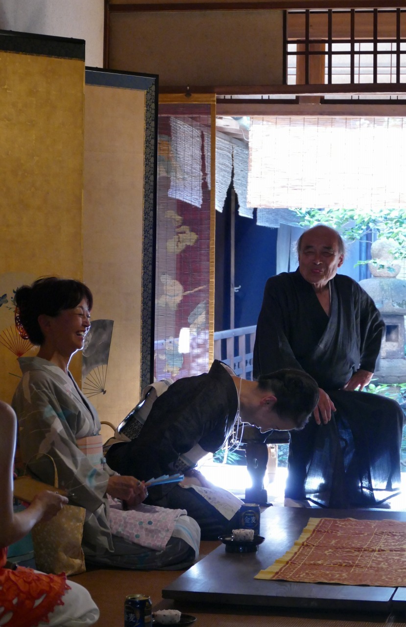 曳初の後、吉田孝次郎さんのお話を伺いながら、しばし談笑。吉田家の2階から曳初を拝見できたのは、NPO美しい京都が運営している「吉田塾」の塾生だからなんです。