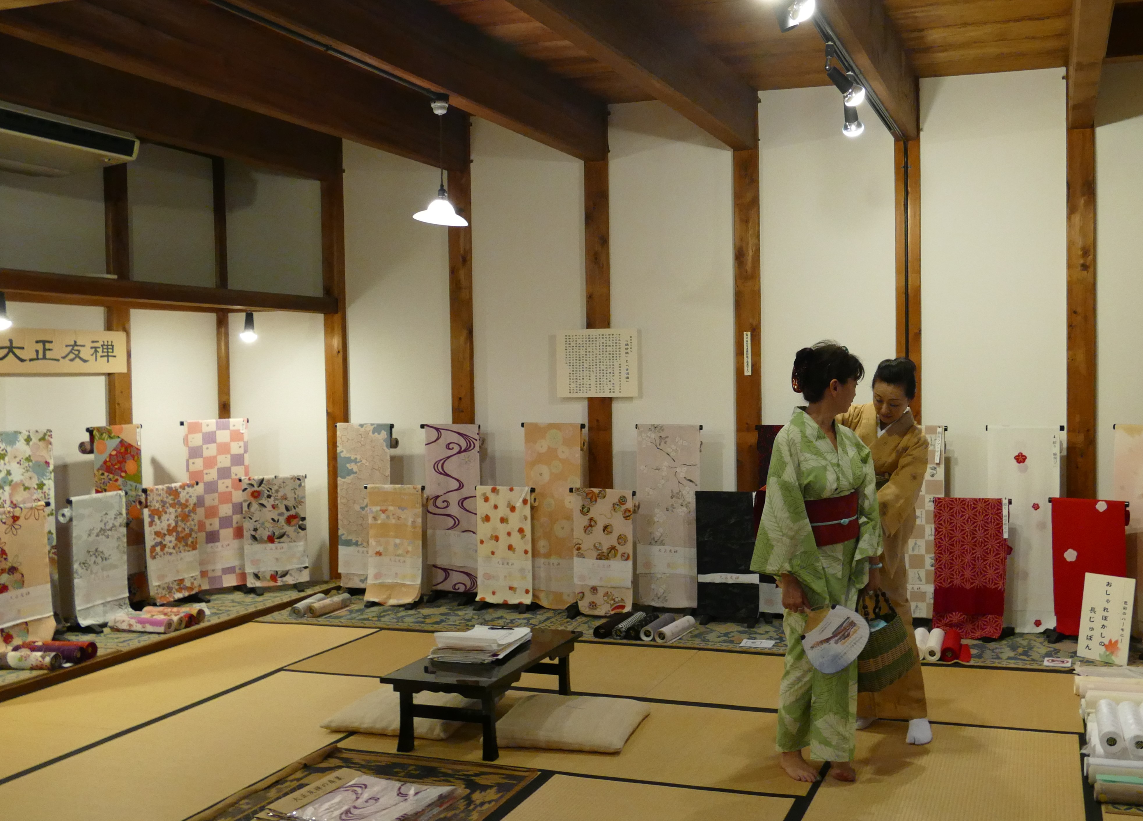 2017年7月 黄緑の芭蕉の葉文で 2017.07.15 Posted on 2017年7月15日2019年1月3日 by AKIO Satoko 紫織庵へ。私の浴衣のほとんどは、ここで購入。襦袢が陳列されている部屋で、着付けの先生が、帯結びを直してくれています。