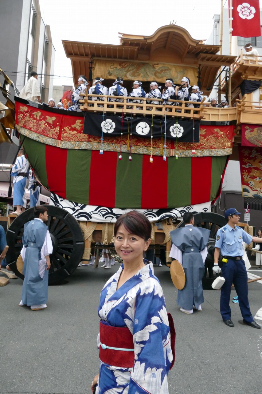 お向かいがマンションに変わってしまい興ざめですが、大船鉾の大きさ、おわかり頂けるでしょうか。大船鉾が通過した後は、私も新町を北上。渋滞している大船鉾の横で記念撮影。ここからも規模が伝わるかと思います。