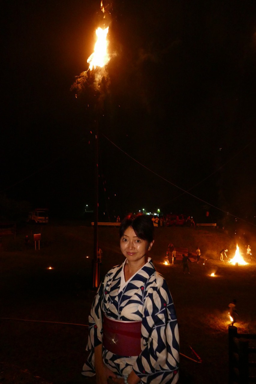 広河原など観光客にも知られる地域では30分ほどで終わるように多くの火が投げ入れられるのだろうが、美山は人数が少ないせいか、着火までに時間がかかる。あんなに高くまで届かないのではないか。もう少し、惜しいなどと、ハラハラドキドキさせられるところがスリル満点。着火した後は柱を倒して終わる。