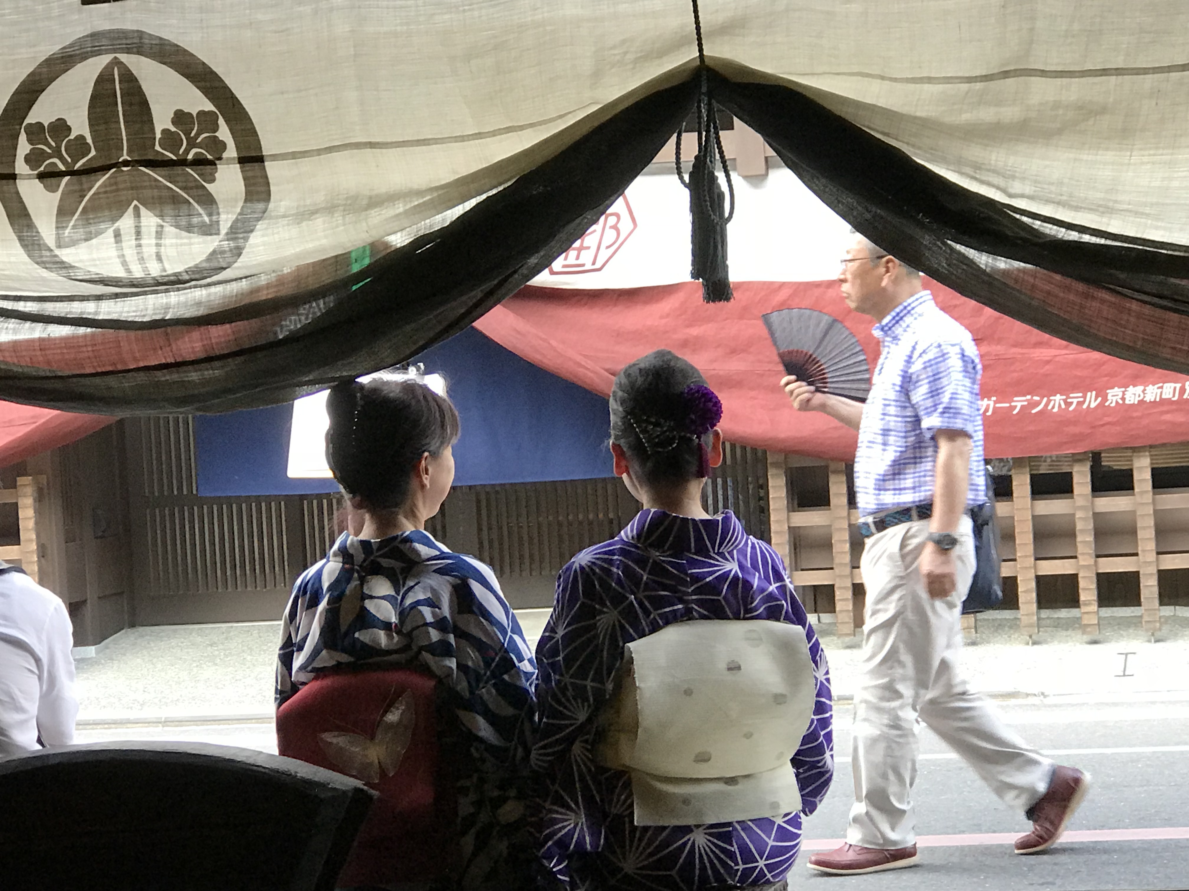 山鉾巡行の見どころはいろいろありますが、最も優雅なのは、新町通の京町屋の二階で、巡行を終えた鉾が南下していくのを見ることでしょう。それには、ご縁がなければ、そこに入ることができない、ある種の特権なのです。今年はそれがかない、しかも浴衣姿の芸妓さんたちとご一緒できたのです。